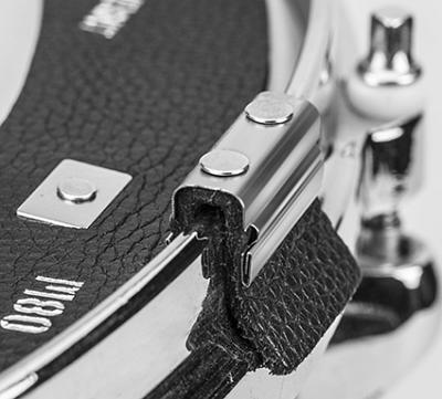Der M80 wurde entwickelt, um den Anteil an gewünschten Obertönen einer Trommel perfekt zu kontrollieren, ohne dass man dabei Abstriche bei der Klarheit des Sounds machen muss. Die Dämpfung lässt sich mit einem einzigen Handgriff einstellen; möchte man gar keine Dämpfung, klappt man sie einfach komplett weg vom Fell. Mit einem M80 kann man 4 verschiedene Dämpfungsgrade erreichen: Stark, mittel, wenig und keine Dämpfung. Zusätzlich verkürzt es durch sein Eigengewicht ein ungewünschtes Nachklingen der Trommel. Sie passen für jede Größe zwischen 8" und 18" und lassen sich auf alle Triple Flange Hoops, Die Cast Hoops, Angel Hoops, True Hoops, Brass Hoops oder ¼" Wood Hoops montieren. Die Lederdicke des M80 variiert zwischen 1,5 mm und 2 mm.