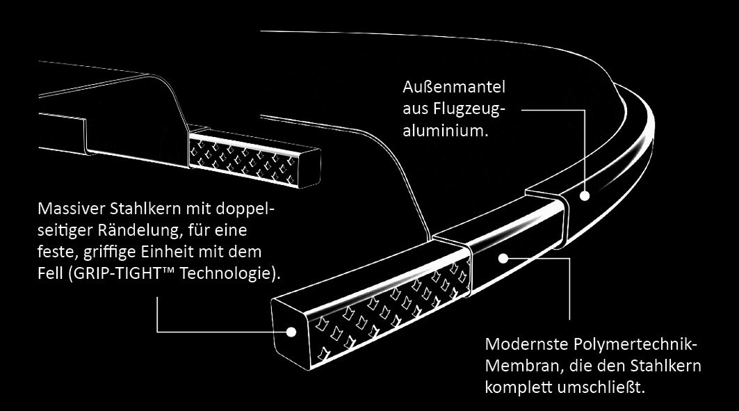 Eine echte Innovation sind die in England entwickelten Code Schlagzeugfelle! Sie haben einen Aluminium Ring mit einem intern verzahnten Stahlkern. Dadurch haben die Felle eine wesentlich bessere und direktere Kesselauflage und lassen sich dementsprechend schneller, besser und genauer stimmen. Das Frequenzbild der Trommel wird von High-Pitch bis Low-End sehr ausgeprägt wiedergegeben. Durch den Stahlkern sind die Code Schlagzeugfelle noch steifer und schwerer, und dadurch auch wesentlich stimmstabiler als herkömmliche Felle. Last but not least liegen die Code Drumheads in einem Preisbereich, der auch normal sterblichen Drummern den einen oder anderen häufigeren Fellwechsel finanziell ermöglicht.