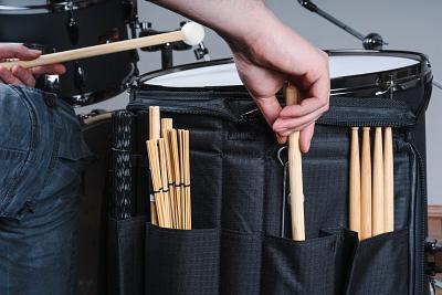 Verwandelt sich mühelos vom robusten Reisebegleiter in ein leicht zugängliches Aufbewahrungssystem während dem Auftritt. Eine durchdachte Taschenanordnung sortiert Sticks, Brushes, Mallets, Multi-Rods, Zubehör und Werkzeuge.